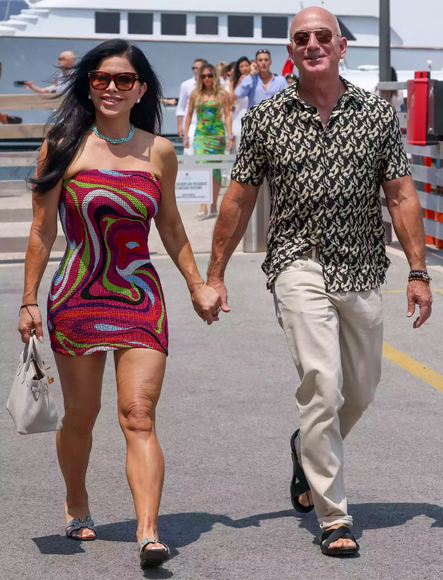 During their outing, Sánchez, 53, donned a vibrant strapless minidress paired with a nude handbag, while Bezos, 59, opted for a patterned button-up shirt and khaki pants. Both accessorized their vacation attire with sunglasses and sandals. Sánchez complemented her new engagement ring with a chunky necklace and sparkly stud earrings.