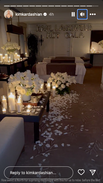 Kim Kardashian's 9-year-old daughter, North West, pleasantly surprised her mom with pre-Met Gala massages. The 42-year-old reality TV star traveled to New York City on Sunday with North and her cousin, Penelope Disick, in preparation for the highly-anticipated fashion event. Kim shared a video of their hotel room, adorned with candles, white rose petals, and silver balloons bearing the words "Karl Lagerfeld Met Gala." "How sweet is North for surprising me tonight with this for us to relax before the Met," Kim captioned the video featuring her eldest daughter. In the clip, Kim expressed her gratitude for the massages, saying "Massages before the big day! Beautiful."