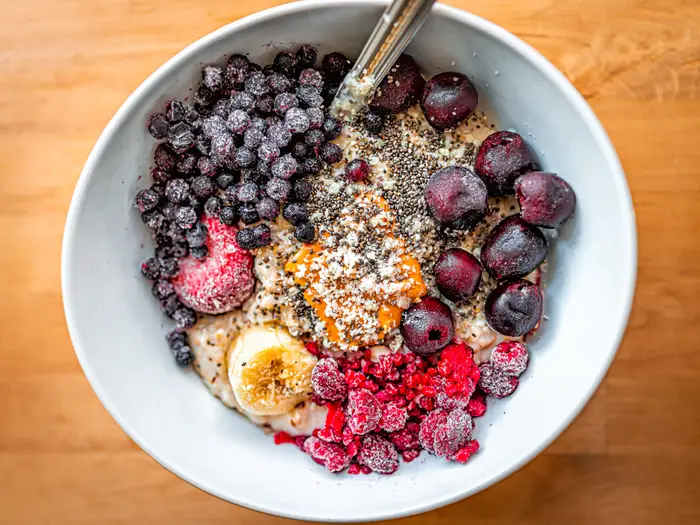 Kirsten Jackson adds frozen fruit to her oats for sweetness, stating that it is a more cost-effective option than fresh fruit and contains a higher concentration of micronutrients due to the freezing process preserving them.
