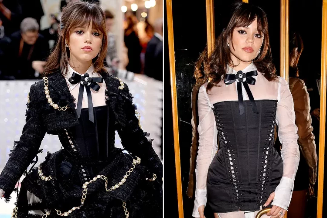 The star of "Wednesday" brought her signature dark style to the Met Gala, sporting two sleek black and white ensembles, both reminiscent of her iconic character. She wore a monochromatic black and white look for the major fashion event, complete with several frills and ruffles. Her outfit included a black Thom Browne corset dress with a white collared undershirt, a black bow, a black bolero-style long-sleeved jacket, and a large detachable ruffled skirt that fanned out behind her, showcasing her legs.