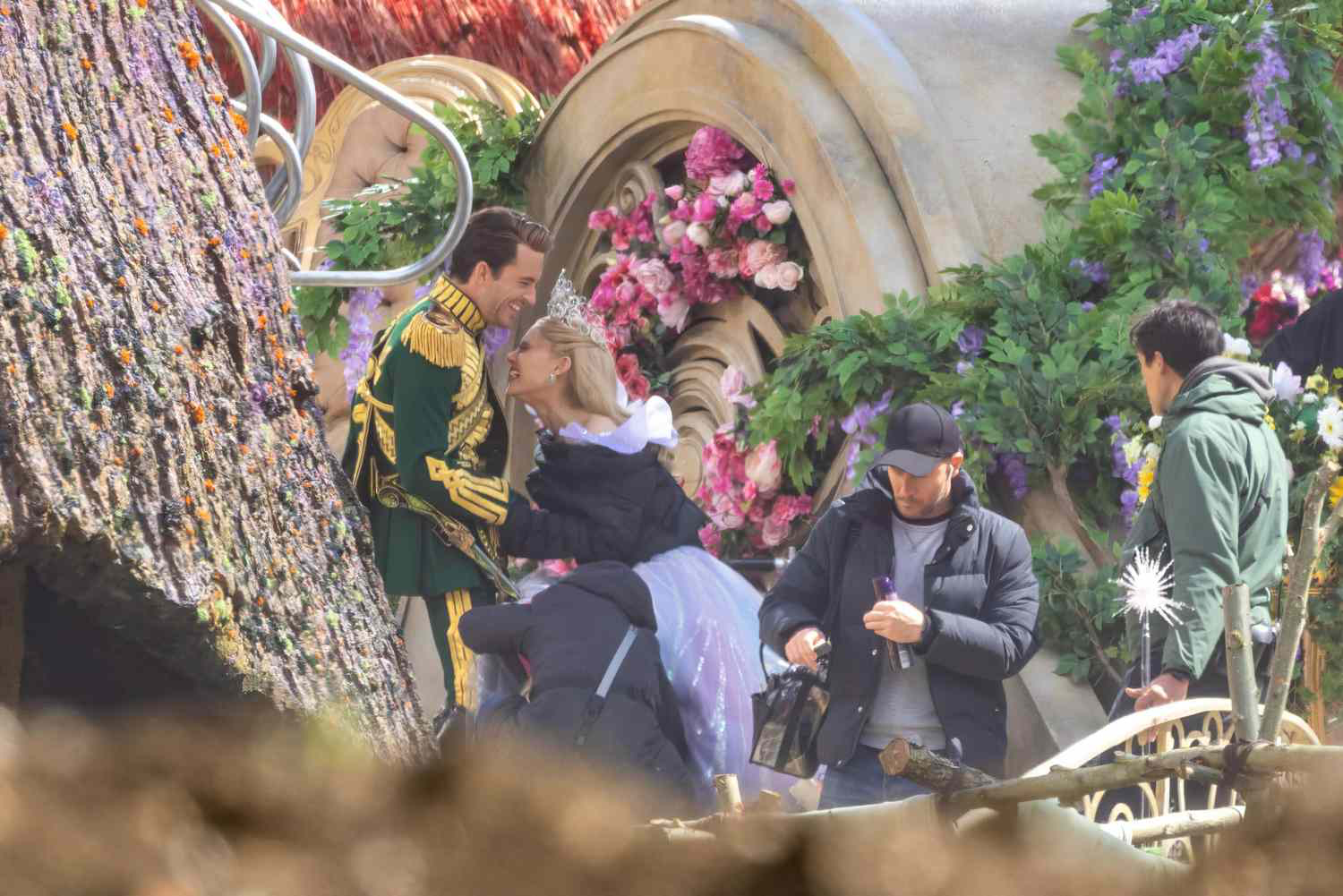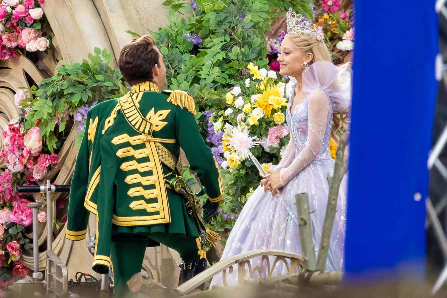 On Sunday, Jonathan Bailey, known for his role in Bridgerton, was spotted filming scenes as Fiyero for the first time on the set of Wicked. Meanwhile, Grande, who plays Glinda, was seen wearing a tiara, gown, and carrying a sparkly scepter. The two were captured on set in full costume, exchanging laughs and chatting in-between takes.