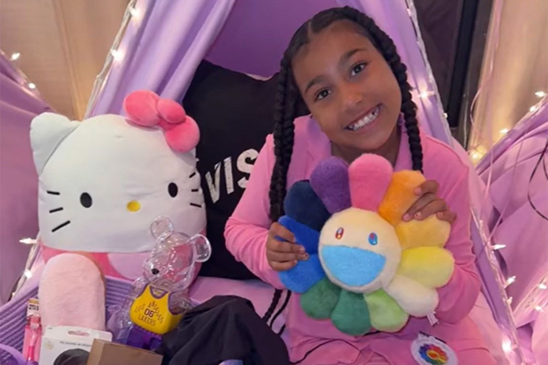 North and her friend Eva enjoyed a joint birthday celebration at the prestigious Beverly Hills Hotel, and the details were nothing short of spectacular. In a video shared by Kim Kardashian on TikTok, the girls can be seen surrounded by enchanting decor and personalized touches. The purple slumber party tent bed, adorned with fairy lights, served as the centerpiece as North posed in her pink pajamas. Holding a vibrant flower cushion, she exuded joy while being surrounded by a basket of gifts, a Hello Kitty cushion, and a specially personalized bag bearing the names 'North + Eva'.