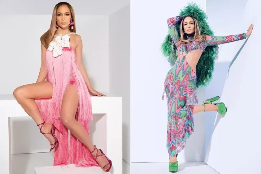 The initial shots capture Lopez in all her sultry glory, as she confidently flaunts her back while donning a vibrant, multicolored cutout print dress adorned with silver tassels. Completing the ensemble are eye-catching shimmery green pumps that effortlessly draw attention.