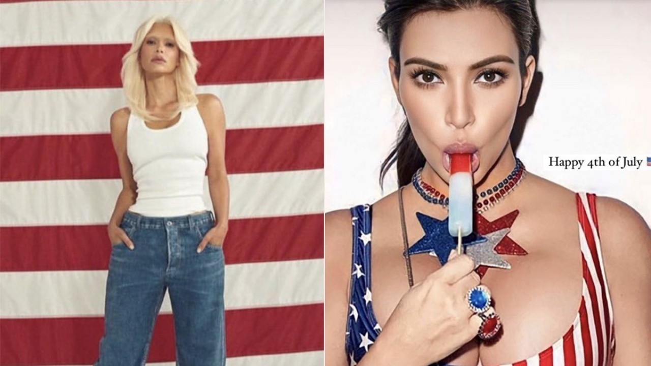 Notably, Kim drew attention to this dramatic change by juxtaposing it with an older Fourth of July-inspired photo. In the older picture, she showcased her dark brown hair slicked back, wearing a low-cut American flag swimsuit that accentuated her cleavage. The image exuded a vibrant, patriotic spirit as she playfully held a red-white-and-blue popsicle while gazing confidently into the camera, adorned with red, white, and blue jewelry.